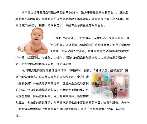 公司以“寶寶開心,媽媽放心,全家舒心”為企業目標,以“科學護理,促進嬰幼兒健康成長”為企業宗旨,利用先進的管理技術,國際化的人才資源;依托強大的品牌效應,完善的產品結構和成熟的營銷體系;以系列化、專業化、人性化、精致化的商品伴隨著眾多寶寶度過快樂幸福的時光,使專業的孕嬰用品深入每一位父母心中!