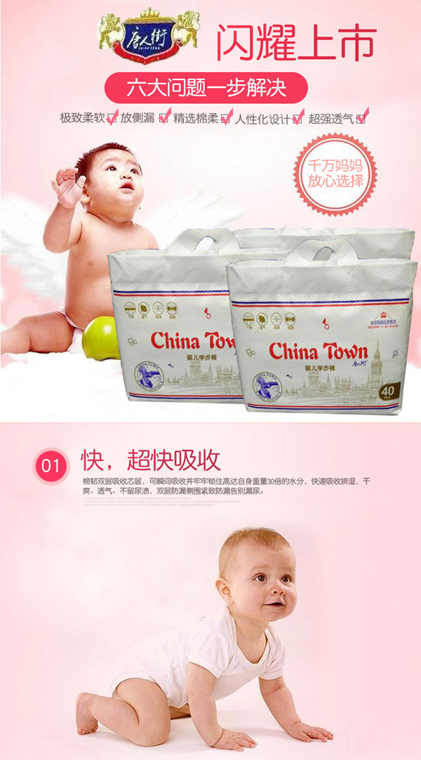 采用全芯體吸收層,不斷裂,不起坨,貼身綿柔,配合科學化的產品設計不僅讓尿液吸收速度加快更令吸收量大幅度提升到了800ml。極致熱風底膜,超過10000個透氣孔,透氣舒適。親膚透氣底膜,良好的透氣性的PE膜,形成有效的縱向對流快速導出廢氣和濕氣,沒有紅屁屁,讓寶寶的皮膚盡情的呼吸。360°雙層立體防側漏,寶寶怎么動都不怕。