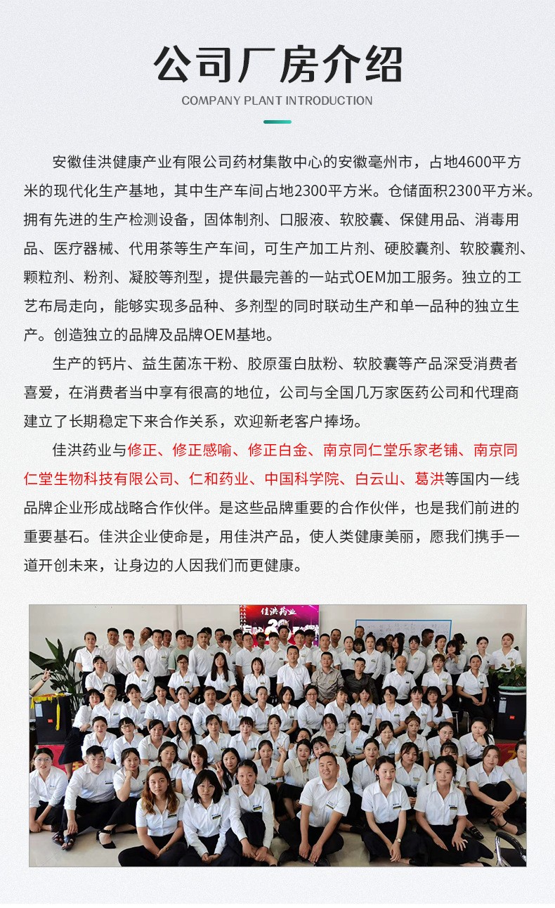 安徽佳洪健康產(chǎn)業(yè)有限公司位于全球最大的中藥材集散中心安徽亳州市,占地4600平方的現(xiàn)代化生產(chǎn)基地,其中生產(chǎn)車間占地2300平。倉儲(chǔ)面積2300平。國(guó)際先進(jìn)的生產(chǎn)檢測(cè)設(shè)備,固體制劑、口服液、軟膠囊、保健用品、消毒用品、醫(yī)療器械、代用茶等生產(chǎn)車間,可生產(chǎn)加工片劑、硬膠囊劑、軟膠囊劑、顆粒劑、粉劑、凝膠等劑型,提供最完善的一站式OEM加工服務(wù)。獨(dú)立的工藝布局走向,能夠?qū)崿F(xiàn)多品種、多劑型的同時(shí)聯(lián)動(dòng)生產(chǎn)和單一品種的獨(dú)立生產(chǎn)。創(chuàng)造獨(dú)立的品牌及品牌OEM基地。