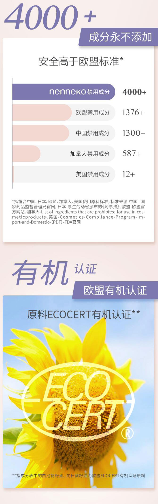 霓奈可孕婦身體乳,天然有機植萃,科學撫平紋路,以有機白池花籽油、有機向日葵籽油、積雪草提取物等主要成分,富含純植物角鯊烷、維生素E、氫化卵磷脂等,不含酒精、色素、激素、重金屬、熒光劑等,12類無添加,安全高于歐盟標準,純凈配方,天然成分,守住美麗,孕肌脆弱肌適用。3D立體保濕網,親膚滋潤,鎖水保濕,緩解緊繃;HCL修護因子,緊致增彈,淡化紋路。