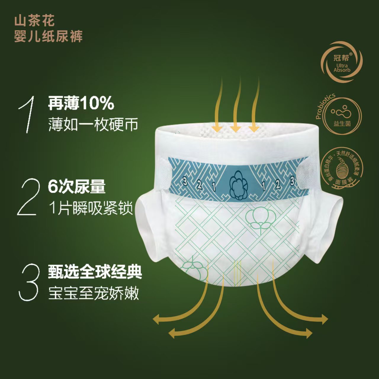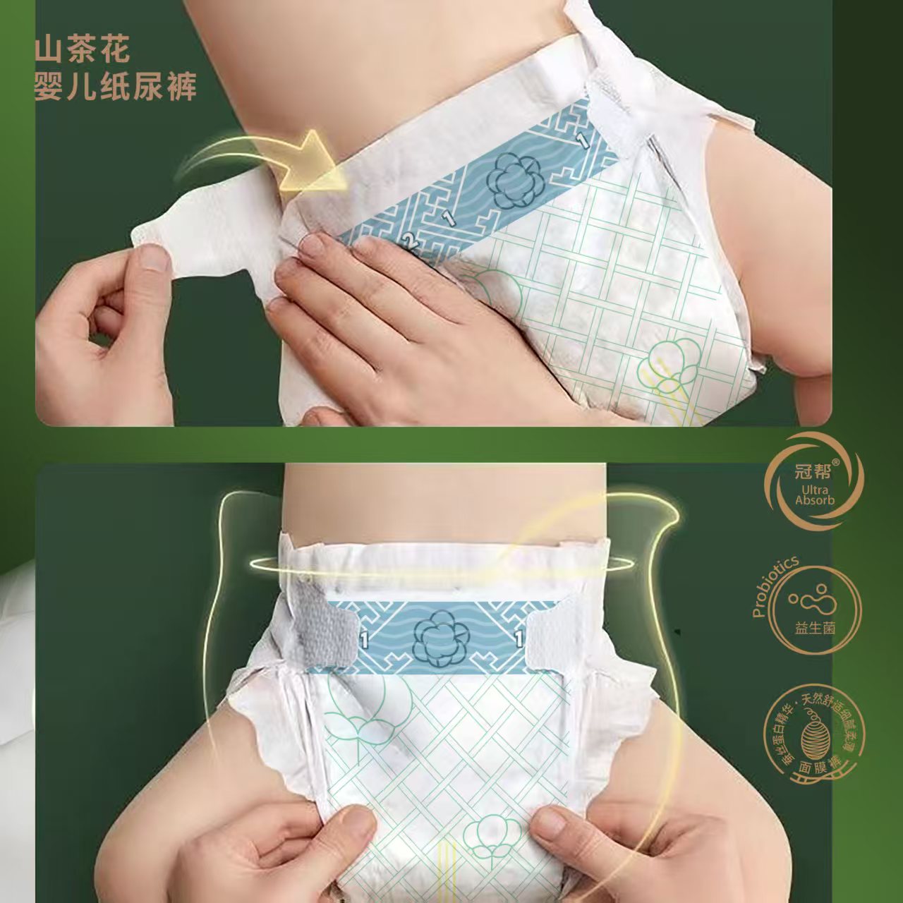 在產品外觀上,山茶花益生菌尿褲以純白山茶花為視覺核心,搭配清新綠葉元素,包裝設計盡顯自然質感,在母嬰渠道中極具辨識度,能快速抓住消費者目光,為終端銷售賦能。