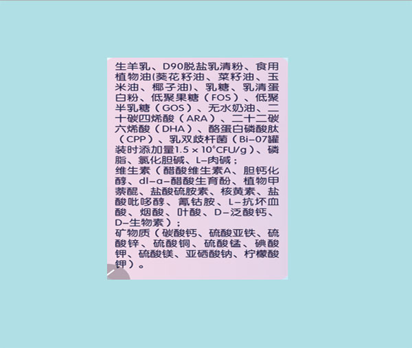 蓓萌羊奶粉是新政后工廠生存和發展的核心品牌,采用的高山牧場奶源,純凈安全,添加OPO結構脂和D90脫鹽乳清粉,全面提升寶寶成長發育所需營養和對營養的吸收及利用,同時,采用國際國內先進的生產技術和產品檢測技術,專注每一罐蓓萌羊奶粉的安全品質,呵護每一位寶寶健康成長。