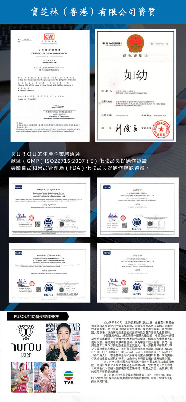 “如幼”品牌釋義:如嬰兒肌膚,幼嫩、爽滑!寶芝林(香港)有限公司旗下品牌,利用香港特殊貿易自由港的優勢,背靠國內、立足亞洲、面向全球市場,繼成了“寶芝林”的行醫濟世、仁德惠眾的歷史文化和中國的傳統配方遺產,結合目前國際最先進的技術和工藝,2008年以來在醫藥、保健、食品、化妝品行業大力發展國內和海外市場,新技術、新原料、新配方的開發和應用,一大批新產品面世,特別是特殊功效產品卓越效果,得到了國內外消費者的青睞,多個品牌在市場上逐漸成為各功效類別的銷量領頭產品。