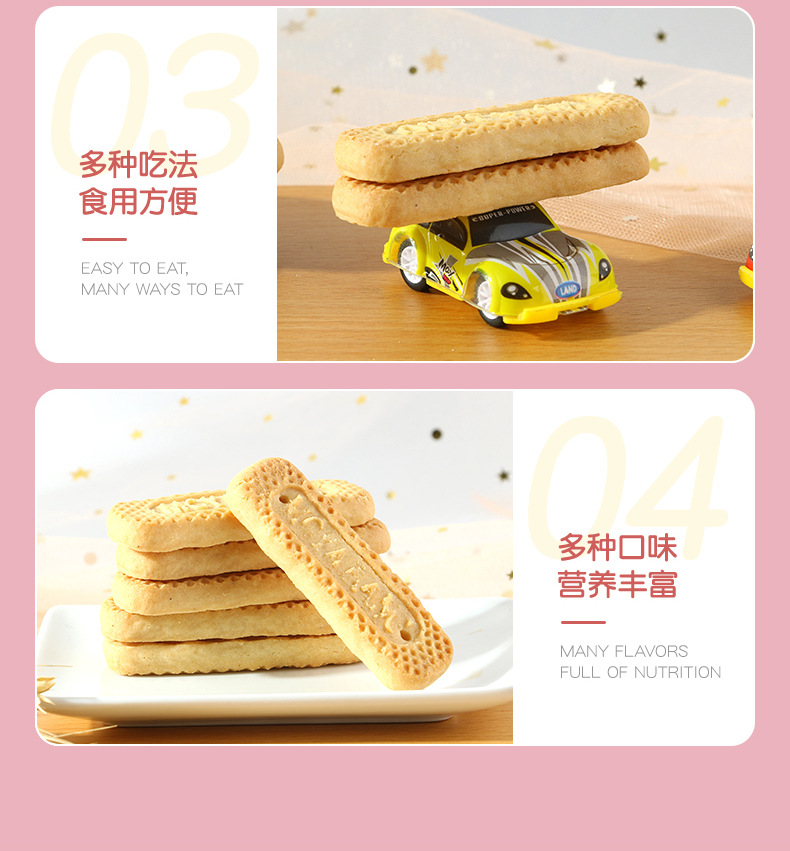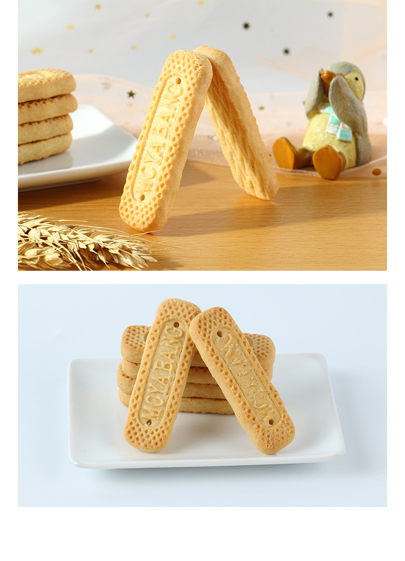 OEM貼牌代加工兒童酥性長條餅干500g logo定制牛奶芽芽棒谷物餅干產品展示